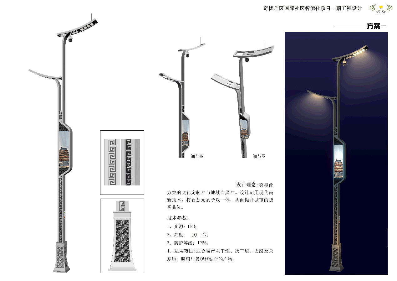 1.智慧燈桿功能模塊化:以智慧照明系統(tǒng)為基礎(chǔ)功能,可選配備WIFI熱點(diǎn)覆蓋功能、攝像頭模塊、充電樁功能、4G/5G信號(hào)覆蓋功能、物聯(lián)網(wǎng)RFID以及信息發(fā)布功能等。燈桿采用模塊化設(shè)計(jì),各功能模塊相互獨(dú)立,預(yù)留安裝孔位、供電模塊、傳輸連接模塊等。可以根據(jù)客戶需要,按需組合、靈活配置,以適應(yīng)不同的使用場(chǎng)景。